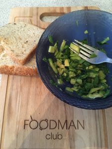- Нарежете авокадото на парчета и омесете с вилица до гладкост консистенция, нарязайте ситно спанака и смесете с авокадото.