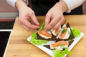 Обелете авокадото, нарежете ситно и смесете с майонезата. Нарежете червената риба (сьомга, пъстърва или розова сьомга) на тънки филийки филийки.