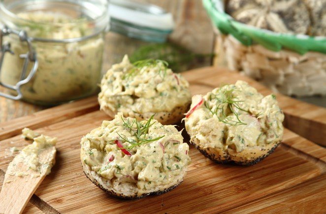 Кифлички с маково семе (можете да вземете всяка по ваш вкус) нарежете наполовина, смажете с приготвена рибена смес, украсете с копър стръкове, сложете в чиния и веднага сервирайте.
