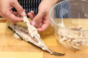 Пушена скумрия, нарязана на филе, отстранете кожата, изпратете в купа и омесете с вилица.