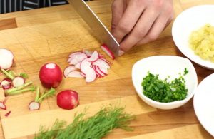 Нарежете туршията на малки кубчета, репичките – тънки филийки, зелен лук с копър (оставете малко) – фино.