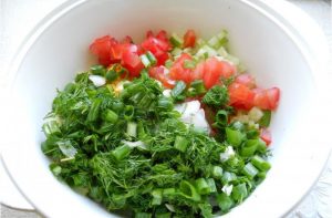 - Нарязваме ситно зелените и нарязваме доматите.