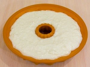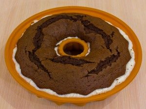 - Готовият охладен кекс нарежете на половина, едната половина оставете във формата, сложете изварата върху нея.