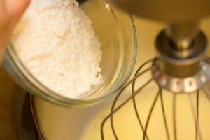 - Пресейте ваниловото брашно и добавете на порции в купата, докато се разбърква.