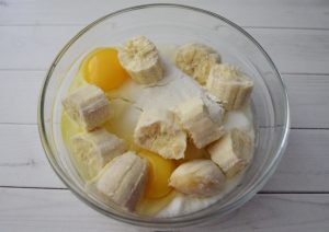 - Комбинирайте извара, яйца и кисело мляко. Добавете банан.