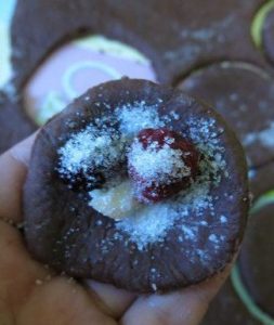 - В центъра на халбата сложете ягодоплодно и парче шоколад, поръсете захар.