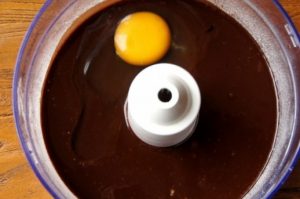 - Изсипете шоколадовата смес в брашнената смес, добавете яйцата.