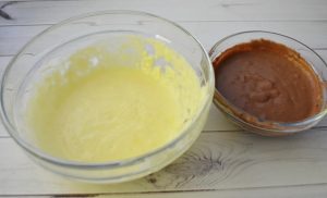 - Тестото се разделя на две части. Добавете какао в едно парче, разбърква.