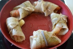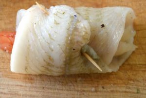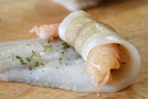 - Овкусете всяко филе със сол и черен пипер и поръсете с нарязан лук. Сложете скаридите върху филето и го завъртете с руло. Secure клечка за зъби.