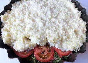 - На дъното на формата разпределяме каймата с равномерен слой, отгоре поръсете с билки.