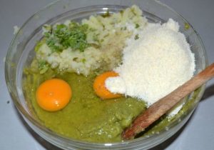 - Караме в яйцата, добавяме сирене, риган, подправяме със сол и черен пипер и се разбърква.
