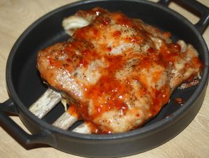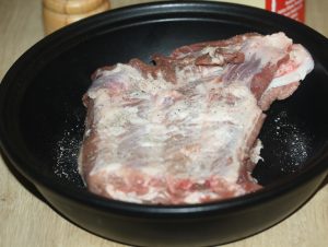 Измиваме цяло парче свински ребра, внимателно разтриваме със сол, смлян черен пипер и се разстила под формата на размер на парче или върху печене.