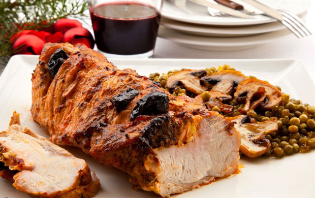 Свинското филе ще се окаже нежно и вкусно, ако го направи предварително мариновайте с билки и малко вино, и след това гответе във фурната у дома. Чудесен сладко-кисел вкус при печенето ще добави месо към сини сливи.