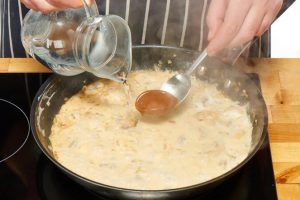 Изсипете вода (250 мл.), Добавете натурален бульон (в желание) и доведе до кипене. Ако не добавим бульона, сол и черен пипер.