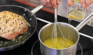Готовата шунка сложете в сгорещено олио и запържете от всички страни, докато стане червен. В тиган загряваме портокалов сок, добавете коняк, мед и доведете до кипене.