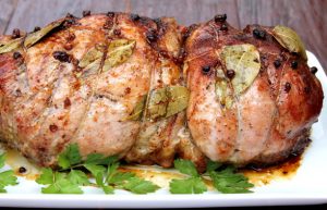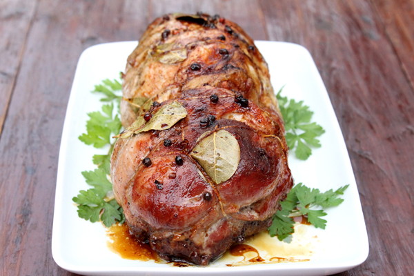 Изваждаме готовото ароматно свинско руло, даваме му почивка 10 минути, накълцайте и сервирайте със зеленчукови гарнитури и салати.