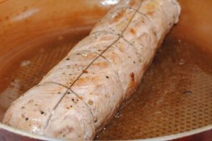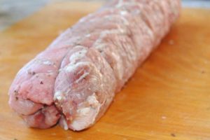 Завиваме свинското пълнено на руло и го оправяме с канап или тесни нишки.