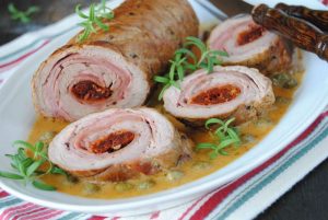 Подгответе се за ролка за дома за почивка от свинско филе с шунка и изсушени на слънце домати. Месото е много сочно и вкусно.
