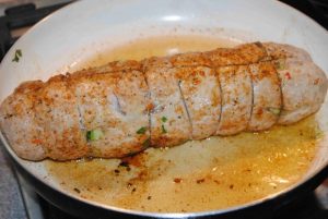 Празнично вкусно свинско филе с руло, пълнено с тиквички, моцарела и магданоз. За да стане месото сочно предварително запържете рулото и след това гответе у дома във фурната.