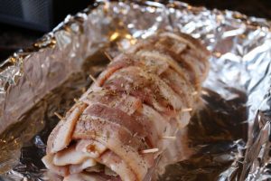 Обръщаме филето с пълнежа в рулото, разпределяме върху лист за печене с фолио. Ние фиксираме с клечки за зъби парчетата бекон, които изпълнете и изпратете във фурната на 180 градуса за 75 минути.