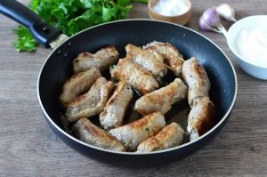 Запържете подготвените рулца в олио до кафяво корички, отстранете в термоустойчива форма.