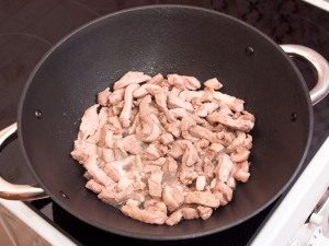 - Запържете свинско нарязано на растително масло в малко олио парчета.