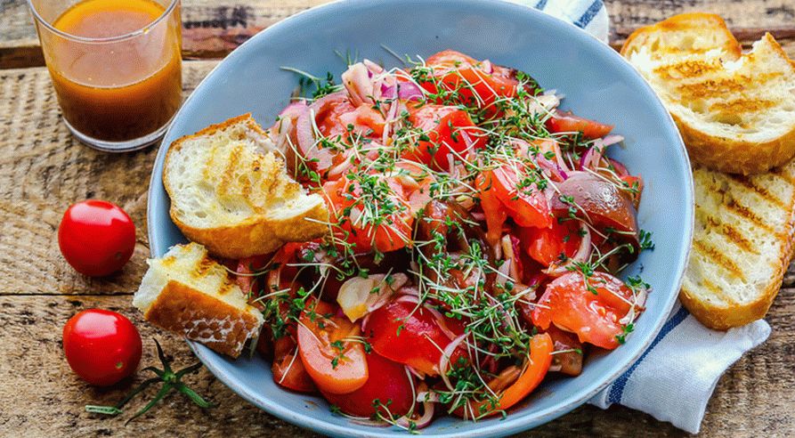 - Избършете лука с кърпа и добавете към доматите. изливам получената дресинг, разбъркайте, поръсете с черен пипер и жар.