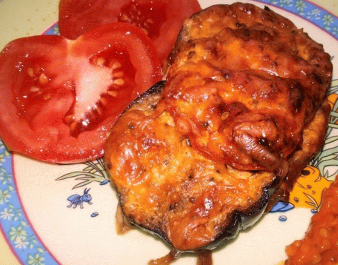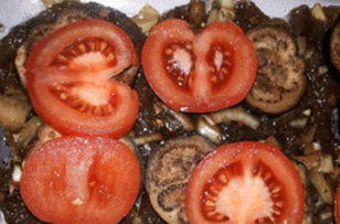 - Разпределяме месото в тава за печене, разпределяме лука отгоре и чесън, след това сложете патладжана и доматите.