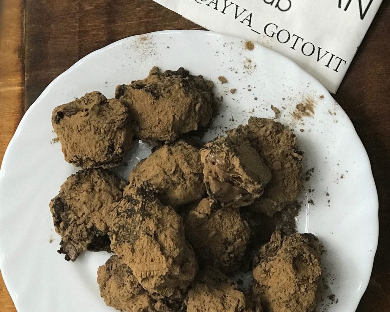 - Разтопете шоколада 53% на водна баня. Потопете разтопен шоколадов бонбон, навийте на ръце и хвърлете в купа с какао, където бързо разточете и разстелете масата.