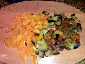 - Обелете готовия патладжан. Чушки и патладжан нарязани на малки кубчета.
