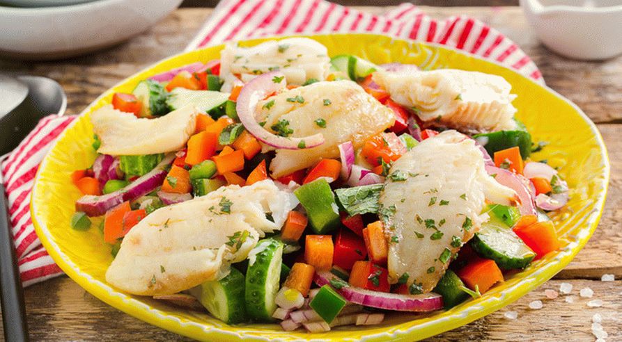 Лека, вкусна и здравословна топла салата с бяла риба, краставица и сладък пипер, лесно можеш да готвиш у дома според моята рецепта. Салата може да се направи за закуска, обяд или вечеря.