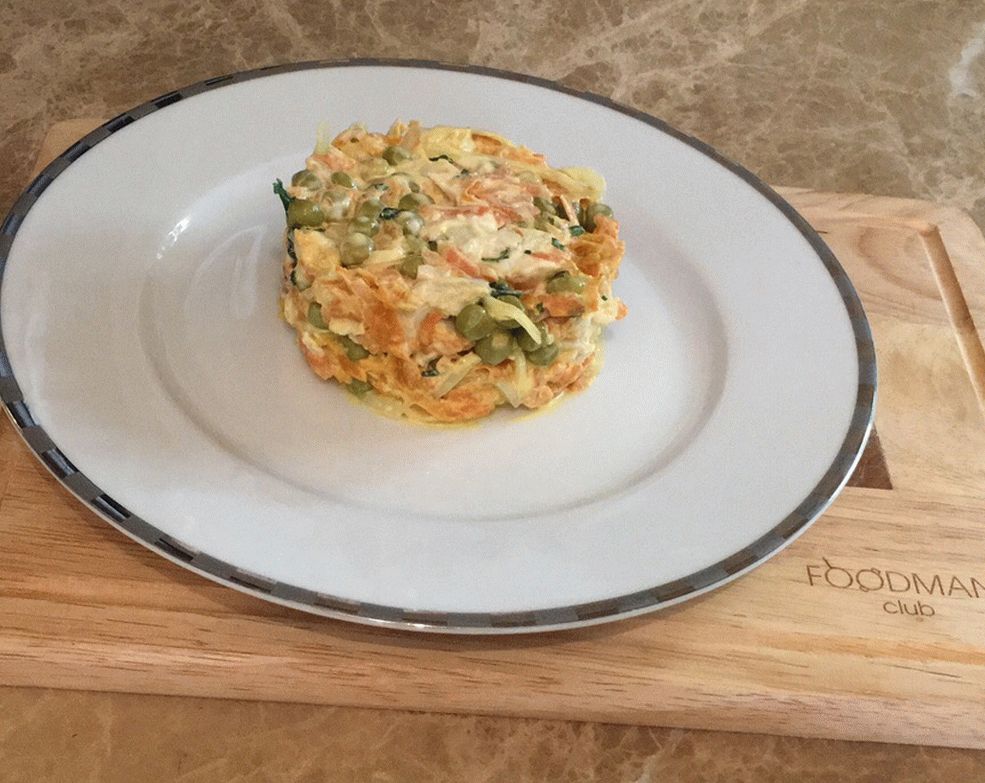 Вкусна и нежна салата от пиле, грах, моркови и лук. Той има сладко-кисел вкус поради кисели лук.