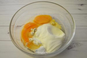 - Добавете яйцата с брашното, разбъркайте всичко с миксер.