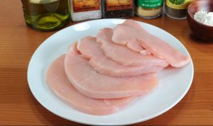 Измийте и подсушете парчетата пуешка гърда с хартия салфетки (кърпи).