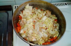 - Нарязан обелен лук, чесън и моркови. Лукови полукръгчета или нарязани на кубчета, филийки чесън, моркови, сламки или пръчици Много ситно нарязан лук и моркови не се нуждаят, те трябва да се усетят вътре готово ястие.