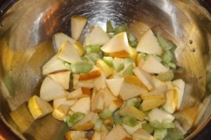 - Измийте ябълките, нарязани на 4 части, отстранете сърцевината и нарязани на кубчета. Поръсете с лимонов сок, за да не го направят потъмнее.