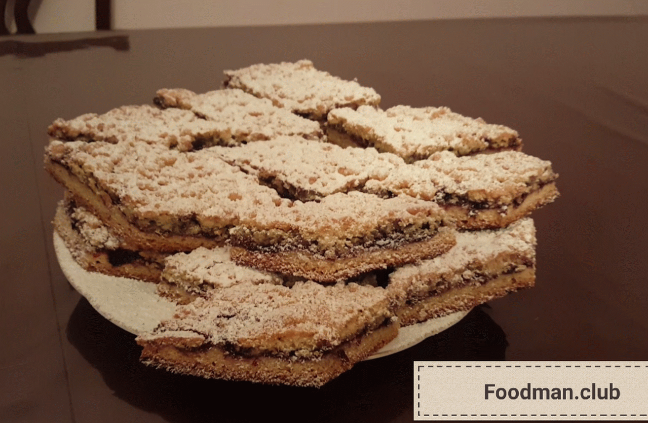 - Когато бисквитката е готова, се нарязва на порции и поръсете със захар за глазура отгоре.