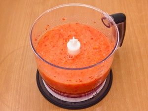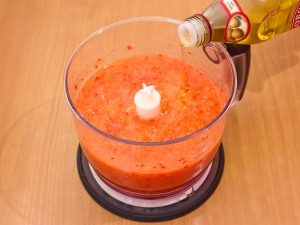 - Смелете доматите в блендер (нарязани обелени на четири части), черен пипер (обелен от семена на септум нарязани на парчета), краставици (нарязани обелени дребен), лук (обелен на парчета), чесън (обелен нарязани на малки парчета).