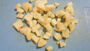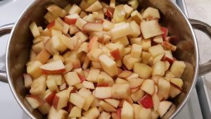 - Измийте ябълките и ги нарежете на кубчета, след като ги извадите ядрото.