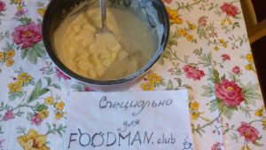 - Обелете ябълките, нарежете ги на парчета, добавете към тестото и разбъркайте добре. Намажете формата с масло. Сложете тестото оформят.