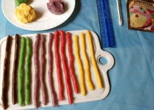 - Покрийте със залепващо фолио и поставете в хладилник за 1 час. По-малкото парче се разделя на броя на използваните храни багрило.