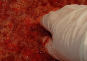 - Отделете едната част, добавете захарта към другата. разтривам ягоди със захар.