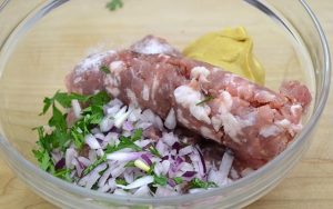 Сложете готовото мляно свинско месо в купа, добавете магданоз, лук, яйце (1 бр.) и горчица.