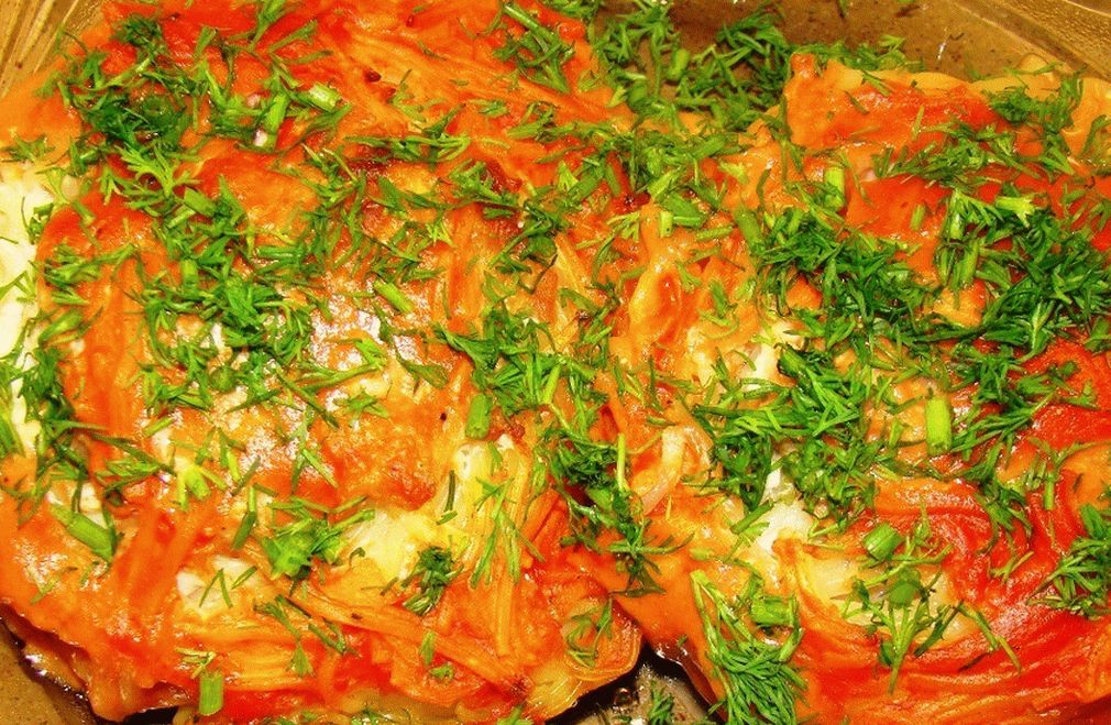 - Намазнете термоустойчив съд за печене с олио, сложете го формата на гнездото. Поставете половин домат във всяко гнездо. обсипвам босилек и залейте сос с олио. Сложете зеленчуци отгоре.