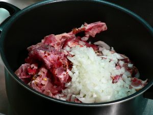 Ние внимателно измиваме парчетата свинско месо върху костта под течаща вода. и го сложете в голям тиган.