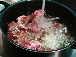 Напълнете костите с вода, за да покриете напълно съдържанието и поставете на силен огън.