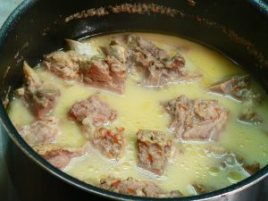 Покрийте и оставете да къкри за 1,5 часа. Месото трябва свободно отделени от костите.
