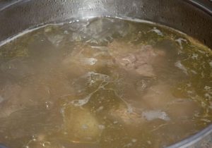 - Варете костите в 1,5 литра. подсолена вода за 2-2,5 часа с дафинов лист и черен пипер. Прецедете бульона.