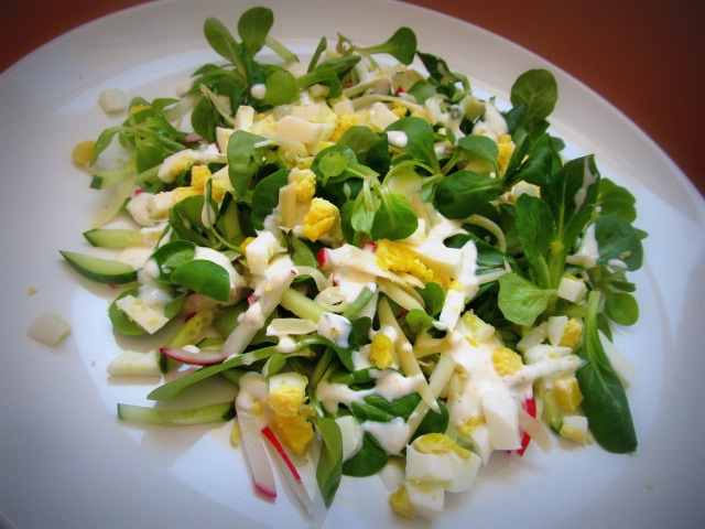- Смесете маруля с краставица и репичка, сол малко и сложете в чиния. Подправете с кисело мляко, поръсете със сирене и нарязано на кубчета яйце. Приятен апетит!