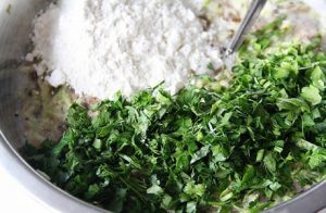 - Смелете зелените. Добавете брашното и тиквата нарязани зелени. Смесете и потърсете консистенция, може да се окаже течен и трябва да добавите още малко брашно.